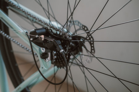 Close up of a Bicycle wheel with details, chain and gearshift mechanism, in morning sunlight.