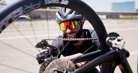 Sports, repair and man with bicycle in street to check wheel, tire and gears for maintenance outdoor. Happy, fitness and person fixing bike in city for cycling, training and active hobby for exercise
