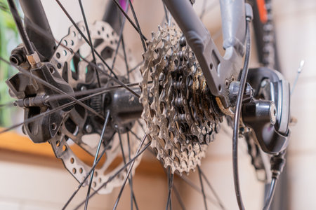 Home bike repair. Preparing for the bike season after winter. Close up shot parts