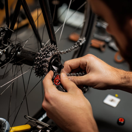Hands of an unrecognizable bicycle technician holding a cassette from a disassembled bike.