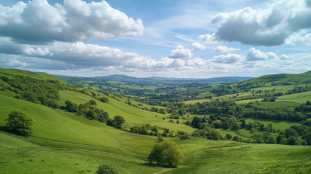 Experience a picturesque countryside scene showcasing rolling green hills under a bright blue sky with fluffy clouds, perfect for showcasing nature's beauty and tranquility.