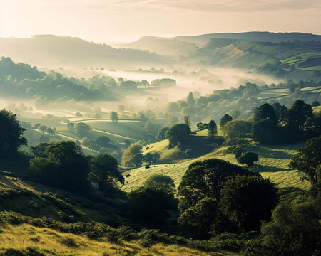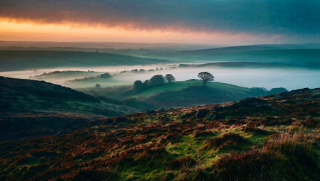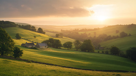 Beautiful sunrise over rolling countryside landscape in the Peak District, UK