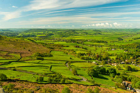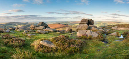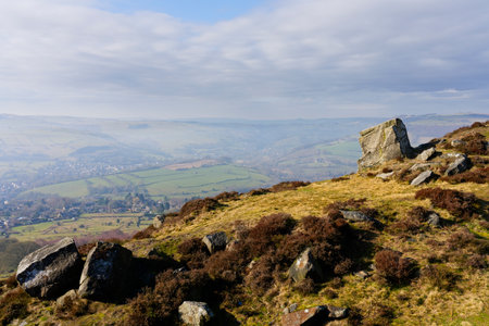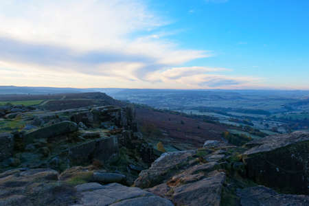 Peak District National Park, Derbyshire, England. Rocks in Stanage edge, with the fields and pastures on the background, selective focus