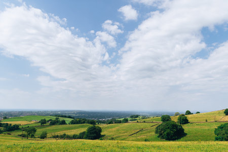 a photo of a hilly land with lush green grass, reminiscent of traditional british landscapes. captured with a pentax 645n, this image showcases the rustic charm and romanticized depictions of wilderness. the flowing forms of the landscape create a captivating scene, reminiscent of national geographic photos. ai generated