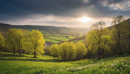 Beautiful spring landscape in the English countryside with sunbeams and clouds