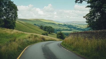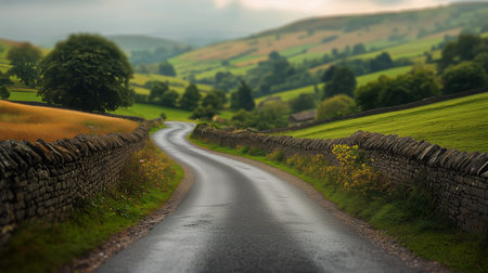 Stock showing a picturesque winding road with a stone wall border traversing vibrant green rolling hills under a clear blue sky, dotted with trees and a small...