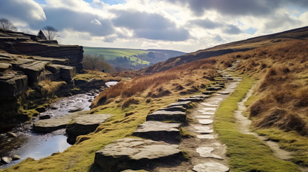 a rugged path winds alongside a picturesque river, adorned with rocks, reminiscent of traditional british landscapes. the image showcases the cross-processing technique, enhancing the terraced cityscapes in vibrant 32k uhd resolution. the color palette features light silver and brown tones, creating a captivating blend of melting pots. the image exudes a sense of grit and grain, adding to its unique charm. ai generated