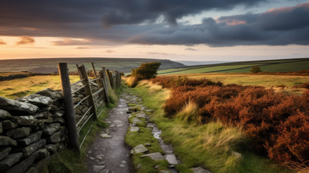 a scenic path winds through rocky terrain as the sun sets in the sky, reminiscent of traditional british landscapes. the light maroon and light green hues add to the pastoral charm, while the contrasty lighting creates a captivating atmosphere. the dark orange and white tones enhance the grandiose landscapes, resulting in a high dynamic range composition. ai generated