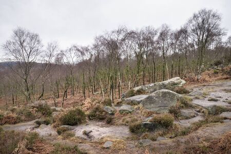 Overcast cold and misty winter morning on the rock strewn top of Curbar Edge in Derbyshire.