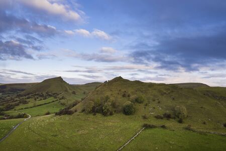 Beautiful aerial drone landscape image of Peak District countryside at sunrise on Autumn Fall morning