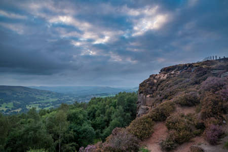 The early morning sun dips behind a swirling cloud darkening the Derbyshire landscape