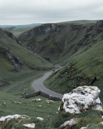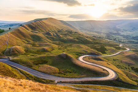 Beautiful winding road and hills at sunset in the Peak District - Landscape view with golden light in the UK - Nature and travel concepts, background ready image