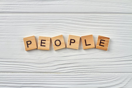 Word people written with wooden cubes. Concept of humankind. Letters on cubes isolated on wooden background.