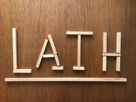 Wood word written in wooden alphabet letters on wooden background. Text on the table for design or concept.