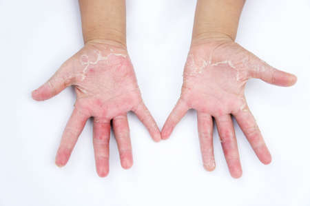 Hand peeling,dry hand,hand hypersensitive, on white background