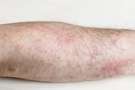 Patient shows arm and hand with red itchy painful rash. Allergic symptom on male hands. Dermatology, skin care. White background, top view