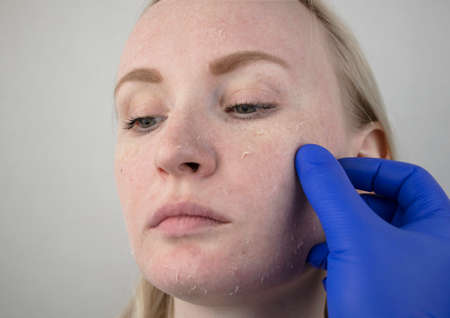 A woman examines dry skin on her face. Peeling, coarsening, discomfort, skin sensitivity. Patient at the appointment of a dermatologist or cosmetologist, selection of cream for dryness