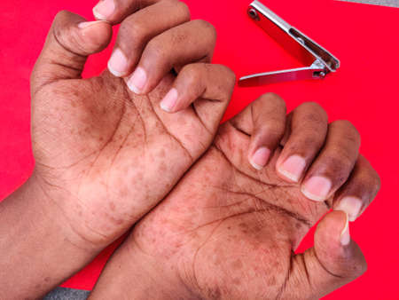 eczema dermatitis on hands and feet. red spots on the skin. dry skinThe concept dermatology, treatment fungal. woman scratching her hand.