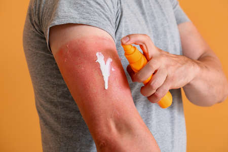 Man with red sunburned skin applying cream against color background, closeup