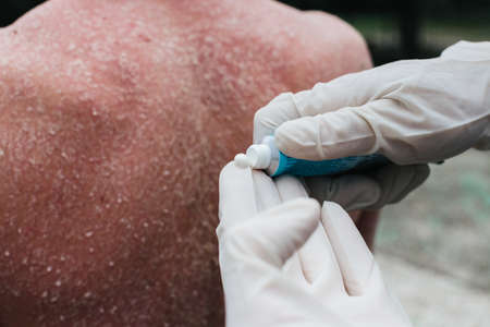 Red skin with blisters on male shoulder and back