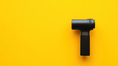 A sleek, black handheld video camera rests on a bright yellow surface, representing modern photography equipment and ideal for creative media projects.