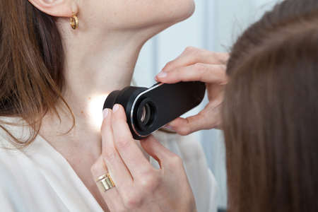 Doctor makes a diagnosis of neoplasms, moles with a dermatoscope, close-up