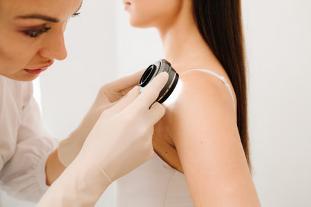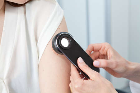 Dermatoscopic analysis aids in the detection of suspicious skin spots using dermatoscope during a clinical exam. Dermatologist Examining Patient Shoulder with Dermatoscope