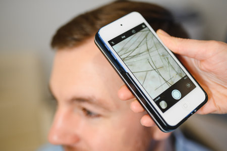 Close-up Of Dermatologist Using Trichoscope For Hair Fall Treatment His Clinic