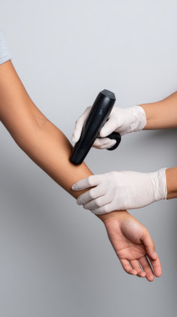Healthcare provider is assessing skin condition on the patient's arm with advanced device, highlighting modern medical technology and patient-focused care in a clinical environment. Cancer