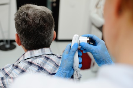a man with gray hair at the reception at the dermatologist. the doctor examines the patients hair using a method trihoskopii