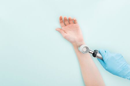 cropped view of doctor examining hand of woman with dermatoscope isolated on blue