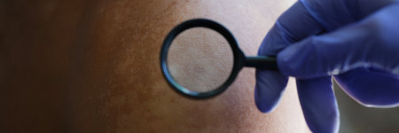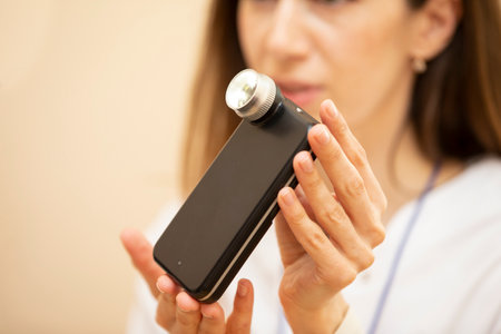 Concentrated dermatologist conducting patient skin check with dermoscope