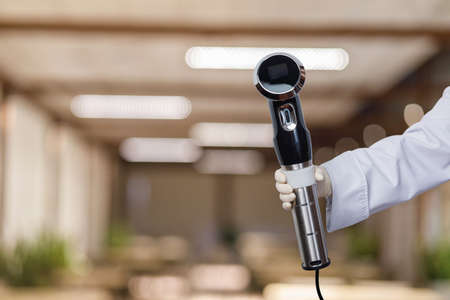 The chef shows an apparatus for working on sous vide technology on a blurred background of the restaurant.