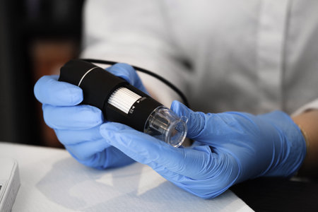 Hands holding special dermatology equipment system, hair loss and trichology concept. Analyzing Hair With Analysis System Digital Trichoscope. Close-up