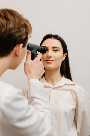 Ophthalmology consultation with an optometrist in a medical clinic. Ophthalmoscopy. Ophthalmologist examines the eyes of woman with ophthalmoscope