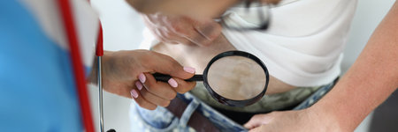 Doctor in rubber gloves examining stretch marks on skin of patients back. Dermatologist holding magnifying glass in hands. Stretch marks prevention and treatment concert