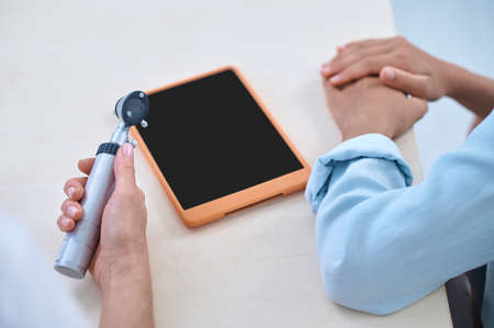 Focus on a dermatoscope to analyze and examine moles and skin growths and neoplasms in the doctor's hand. Early cancer detection concept