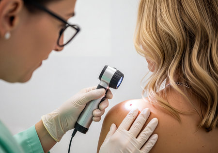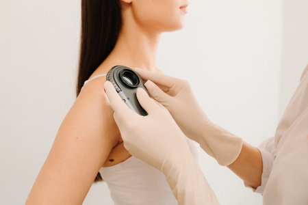 A dermatologist meticulously examines a patient mole on their shoulder using a dermatoscope. this image depicts a routine skin check for melanoma prevention and overall dermatological health.