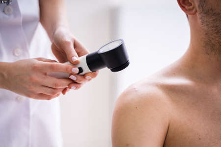 Dermatologist Examining Patient Shoulder with Dermatoscope. Dermatoscopic analysis aids in the detection of suspicious skin spots using dermatoscope during a clinical exam
