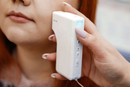 Dermatologist doctor examines moles and birthmarks of female patient in clinic. Doctor using dermoscopy device during client woman skin check. Preventive maintenance of melanoma