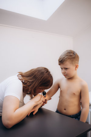 Dermatologist examines child patient birthmark with dermatoscope. Mole checkup. Professional dermoscopy
