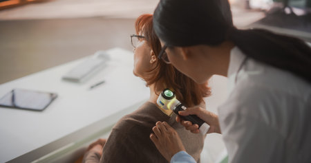 Young Asian Dermatologist is Using a Dermatoscope to Identify Worrying Cancerogenic Tissues on the Skin of a Senior Female During a Health Check Visit to a Clinic. Female Doctor