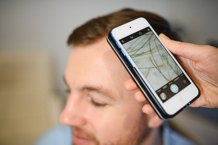 Close-up Of Dermatologist Using Trichoscope For Hair Fall Treatment His Clinic
