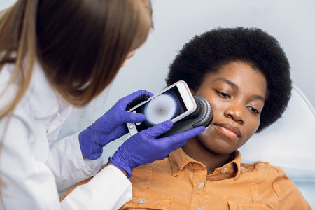 African Skin Care Professional Using a Dermatoscope to Examine Neck Tissue on the Skin of an Attractive Young Black Female During a Health Check Visit