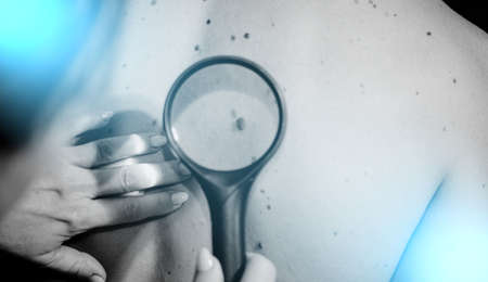 Doctor dermatologist checking benign mole of patient by magnifying glass. Preventing melanoma and skin cancer concept.