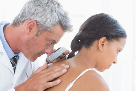 Dermatologist examining the skin on the back of a patient; light effect