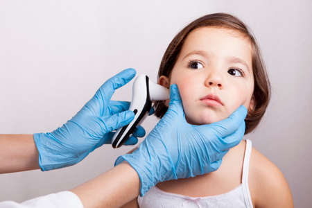 Doctor measuring temperature mistrustful little girl with ear talking electronic thermometer. Isolated over white background