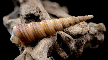 Close-up of a Turritella shell with a spiral structure resting on textured driftwood, isolated against a black background. Highlights natural ridges and details