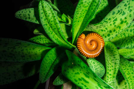 Macro of orange and brown millipede on green leaf, Millipede coiled, Disambiguation, Low key photo.