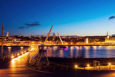 Derry, Ireland. Illuminated Peace bridge in Derry Londonderry, City of Culture, in Northern Ireland with city center at the background. Night cloudy sky with reflection in the river at the dusk